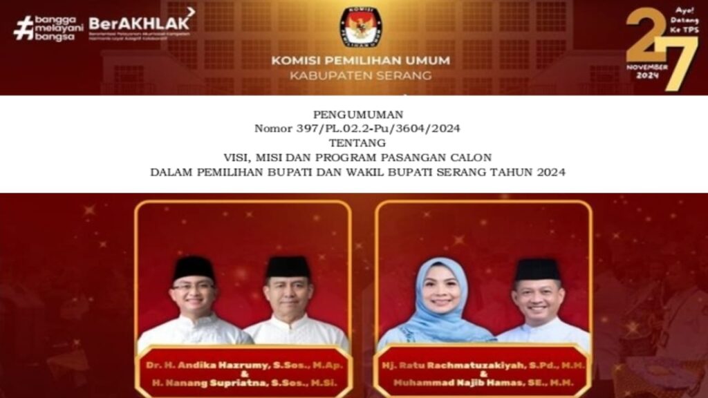 KAB. SERANG, Mediabooster.news – Berdasarkan surat dinas Komisi Pemilihan Umum Republik Indonesia Nomor 2006/PL.02.2-SD/06/2024 tanggal 9 September 2024 perihal Publikasi Visi, Misi dan Program