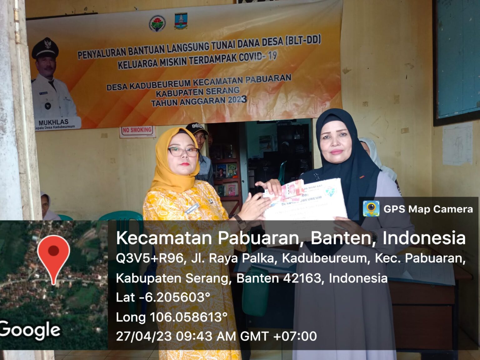 Penyaluran BLT DD dilaksanakan di Kantor Desa Kadubeureum, Kec. Pabuaran, Kab. Serang, Banten, pada Kamis, 27 April 2023 dan dihadiri oleh Perangkat desa dan ditinjau langsung oleh Kasi Kesos Kec. Pabuaran Tini Herawati.