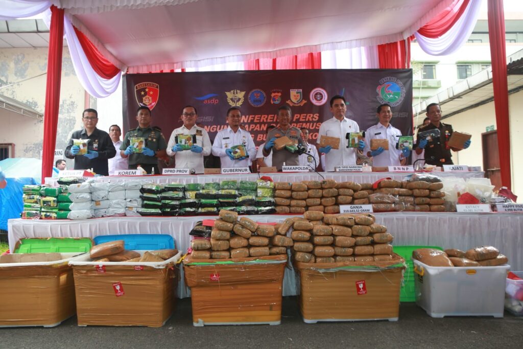 Barang bukti yang dimusnahkan meliputi narkoba jenis ganja 310 Kg, sabu-sabu 171,5 Kg, pil ekstasi 43.381 butir, dan pil happy five 4.998 butir.